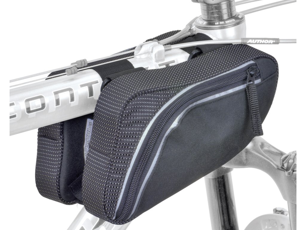 Dvojitá taška do rámu AUTHOR, možnosť umiestnenia do prednej časti rámu (na väčšinu typov rámov), univerzálne uchytenie na suché zipsy, 2 samostatné vrecká (2 x 0,6 l)