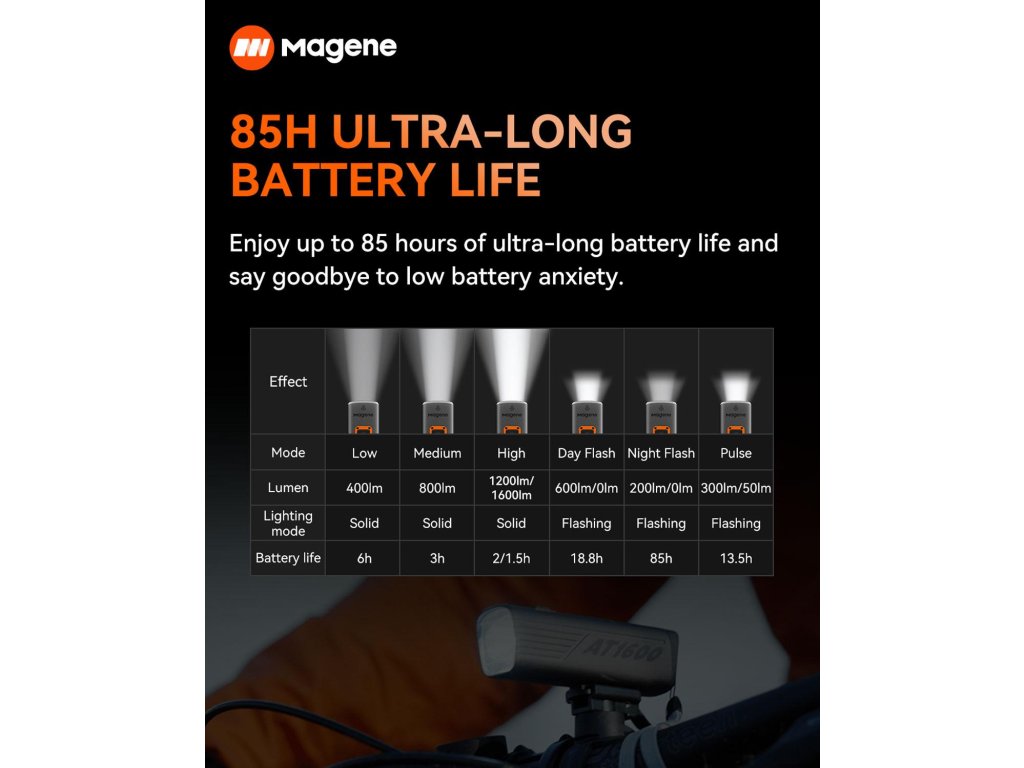 Rýchle nabitie za 2,5 hodiny pomocou USB-C a dlhá výdrž batérie robia zo svetla MAGENE AT1200 spoľahlivého spoločníka na každú jazdu!
