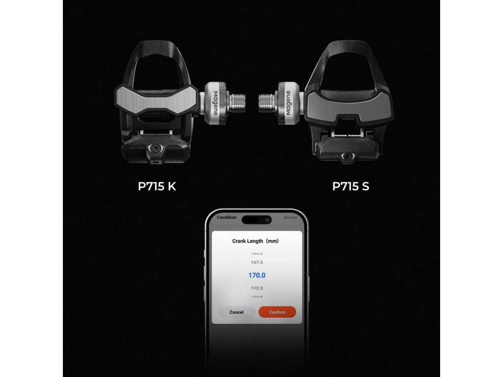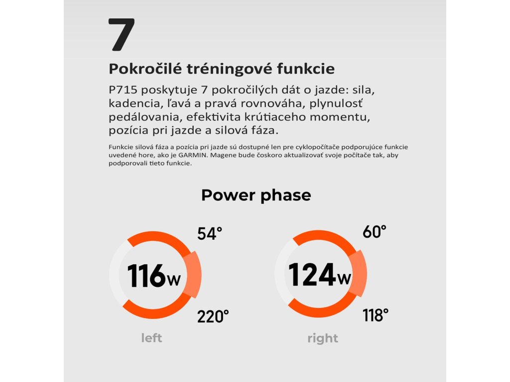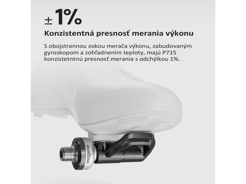 P715 – PEDÁLE S MERAČOM VÝKONU VAŠA CESTA NA VRCHOL CYKLISTIKY S využitím najmodernejších technológií posúva P715 vaše tréningy na úplne novú úroveň. Tieto pedále s presným meračom výkonu vám pomôžu získať viac sily, zlepšiť efektivitu a dosiahnuť špičkovú formu. ±1% Maximálna presnosť merania výkonu 120 hodín Výdrž batérie, ktorá vás nenechá v štichu 7 Pokročilých tréningových funkcií pre rýchlejší progres P715 K & P715 S Perfektne optimalizované pre KEO a SPD-SL zarážky Bez kompromisov: • 100% kompatibilita s vaším bicyklom • Inštalácia za menej než 1 minútu • Bluetooth a ANT+ pre bezproblémové prepojenie Každý watt sa počíta – a my ho meriame presne tam, kde vzniká. Vďaka integrovaným obojstranným meračom výkonu je senzor P715 umiestnený priamo tam, kde vaše nohy generujú silu. Minimalizuje tak straty a chyby pri prenose údajov. Pedále merajú výkon každej nohy zvlášť – v reálnom čase, s maximálnou presnosťou a bez kompromisov. ________________________________________ Inteligentná technológia pre maximálnu presnosť Integrovaný gyroskop Váš štýl šliapania sa mení v každom uhle a okamihu. Gyroskop meria uhlovú rýchlosť v reálnom čase a presne počíta výkon v každej fáze záberu – dokonca aj pri nestabilnej jazde. Teplotná kompenzácia Výškové rozdiely a zmeny teploty už neovplyvnia vaše údaje. Špeciálny algoritmus P715 sa automaticky prispôsobuje prostrediu, aby poskytol konzistentné a spoľahlivé merania – od horských priesmykov až po rozpálený asfalt. ________________________________________ 7 funkcií pre pokročilý tréning a detailnú analýzu P715 vám poskytne omnoho viac než len watty a kadenciu: • Fáza výkonu – odhaľte svoju zónu generovania výkonu, uhol sily a oblasť maximálnej záťaže. Optimalizujte svoj výkon tam, kde naozaj záleží. • Jazdná poloha – porovnajte výkon v rôznych polohách a prispôsobte techniku rôznym situáciám. • Rovnováha ľavej a pravej nohy – vyrovnajte svoje slabšie stránky a trénujte efektívnejšie. • Účinnosť krútiaceho momentu – zistite, ako efektívne prenášate silu do pedálov. • Plynulosť šliapania – analyzujte rovnomernosť výkonu počas celého cyklu záberu. ________________________________________ Rýchla inštalácia S P715 začnete trénovať prakticky okamžite. Montáž je rovnaká ako pri štandardných pedáloch – vložte, dotiahnite kľúčom (odporúčaný moment 30–40 Nm) a môžete ísť. ________________________________________ Flexibilita bez kompromisov • Dva modely: P715 K (KEO) alebo P715 S (SPD-SL) – vyberte si podľa svojich preferencií. • Kompatibilné so všetkými bicyklami so štandardnými kľukami – cestné, časovkové, triatlonové, s okrúhlymi či oválnymi prevodníkmi. ________________________________________ Ľahké, pevné a odolné Kombinácia uhlíkového kompozitu a precipitačne tvrdenej nehrdzavejúcej ocele prináša neuveriteľnú váhu len 157 g – bez straty tuhosti či odolnosti. ________________________________________ Spojenie bez hraníc Podpora Bluetooth aj ANT+ znamená, že sa môžete pripojiť k jednému zariadeniu cez Bluetooth a k neobmedzenému počtu zariadení cez ANT+ naraz. Model P715 K Hmotnosť 314 g Zarážka (cleat) KEO Presnosť merania výkonu ±1 % Q-faktor 55 mm Výška stohu 11 mm Bezdrôtový protokol Bluetooth, ANT+ Dátové funkcie Výkon, kadencia, vyváženie ľavej a pravej nohy, účinnosť krútiaceho momentu, plynulosť šliapania, fáza výkonu, poloha jazdy Kalibrácia Automatická a manuálna Vodotesnosť IPX7 Výdrž batérie 120 hodín Metóda nabíjania Magnetické nabíjanie Rozsah kadencie 20–240 ot./min Rozsah výkonu 0–2500 W Prevádzková teplota -20 až 50 °C Kompatibilné cyklopočítače Kompatibilné s hlavnými cyklopočítačmi vrátane Magene, Garmin, Wahoo, iGPSPORT, Bryton, XOSS, BLACK BIRD a ďalšie. Funkcie fázy výkonu a jazdnej polohy sú dostupné iba na cyklistických počítačoch, ktoré tieto funkcie podporujú, ako napríklad GARMIN a MAGENE Kompatibilný softvér Magene Utility Obsah balenia • Pedál s meračom výkonu ×2 • Podložka pod kľuku ×2 • Nabíjací kábel ×1 • Rýchly návod ×1Dodatočné parametre