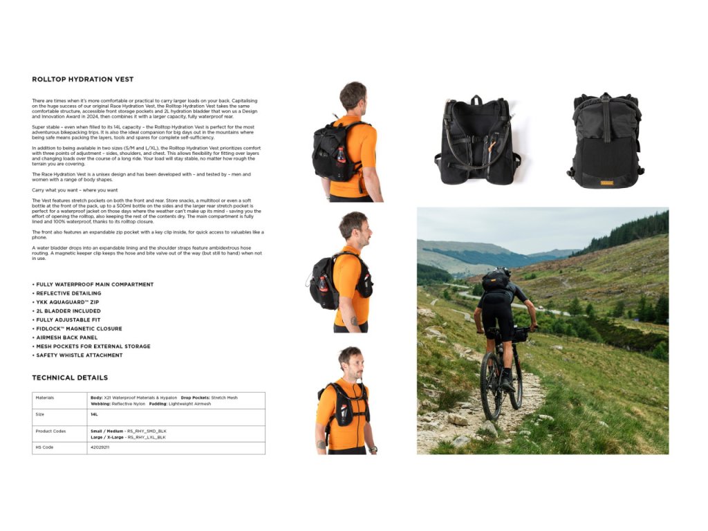 Hydratačná vesta Rolltop, ktorá využíva obrovský úspech našej pôvodnej hydratačnej vesty Race, má rovnakú pohodlnú štruktúru, prístupné predné úložné vrecká a 2-litrový hydratačný vak, ktoré nám v roku 2024 získali cenu za dizajn a inovácie, a kombinuje ich s väčšou kapacitou a plne vodotesnou zadnou časťou.