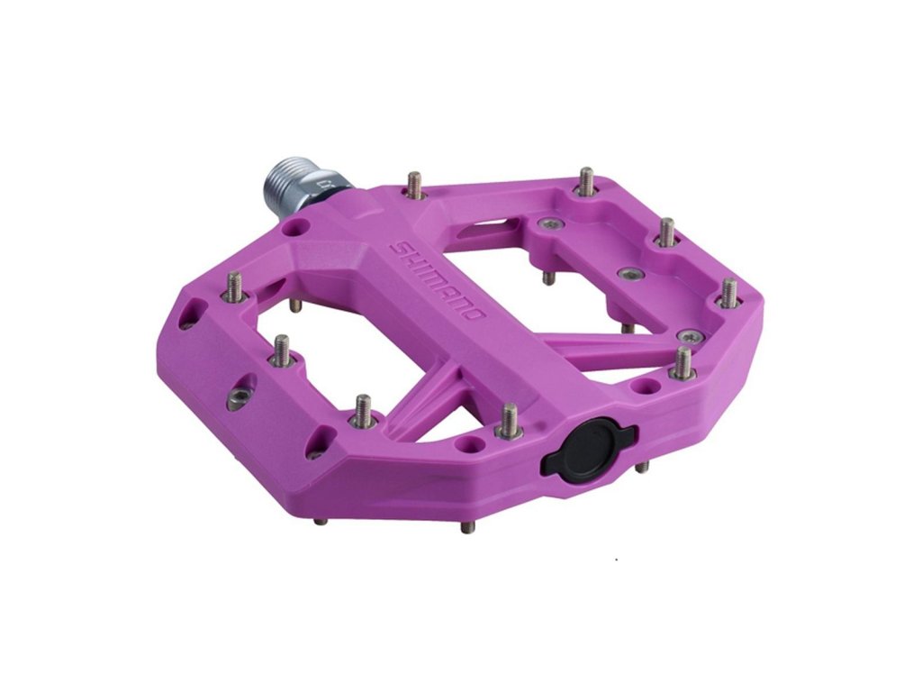 Pedále MTB PD-GR400 bez zámku. Odolné pedále typu Flat pre rôzne jazdné štýly v teréne. Široký tvar pedálu pre lepší komfort, stabilitu a účinnosť šliapania do pedálov. Veľkosť platformy 101x96mm. 9 vymeniteľných pinov na každej strane. Kompozitové telo a oska s odolnou a tuhou konštrukciou. Typ: MTB, Celková váha balenia: 562g, Použitie: Enduro/Trail, obojstranné, Flat, fialové, Materiál: telo pedálu (kompozit), oska (chróm+oceľ)Dodatočné parametre